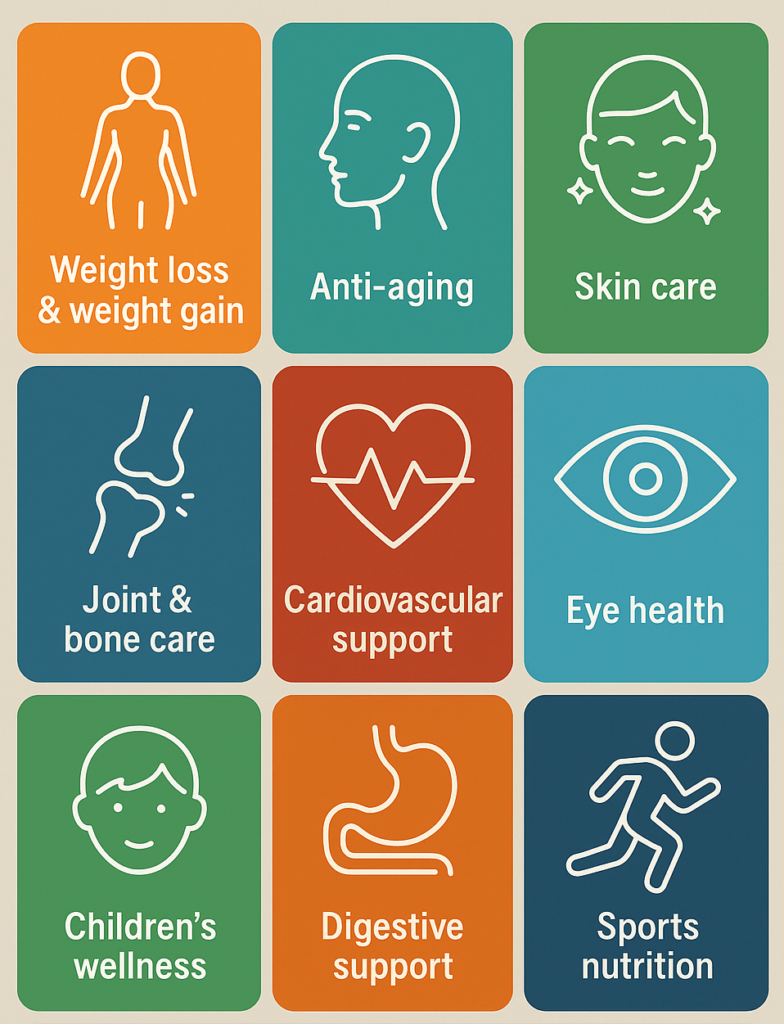 Product-based support for weight gain, weight loss, anti-aging, skin care, joint & bone health, cardiovascular support, eye health, children’s wellness, digestion, and gender-specific wellness.
